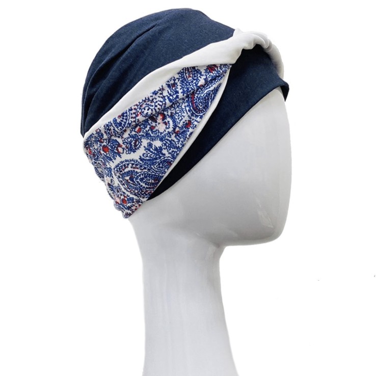 Se compone de un gorro base y una banda semi-unida, con un estampado paisley, ideal para esta temporada primavera/verano, ya que es un modelo muy alegre y favorecedor.