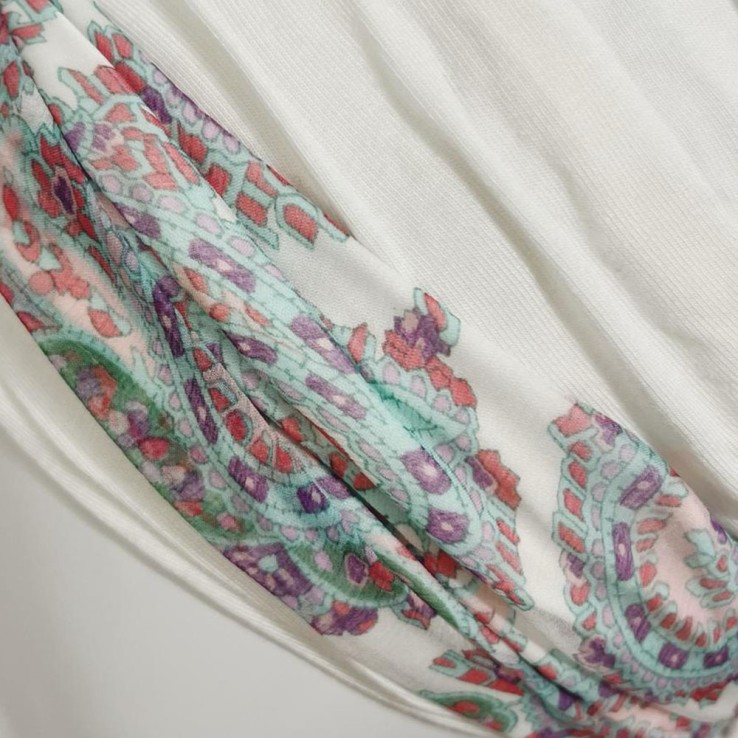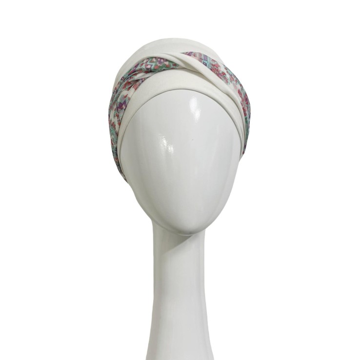 Se compone de un gorrito base en tonalidad marfil junto con una banda semi-unida, que por una cara es marfil y por la otra cara tiene un bonito estampado cashmere en tonalidades vivas y favorecedoras.
