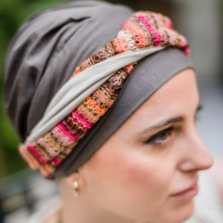 La armonía de colores cálidos realza las facciones y aporta un toque femenino y actual. Su estructura preformada permite colocarlo en segundos, mientras que la banda posterior adaptable garantiza un ajuste cómodo y seguro para contornos de 54 a 56 cm sin necesidad de anudados.