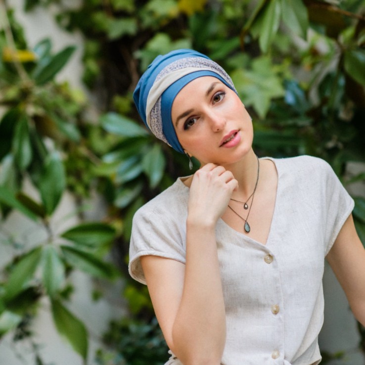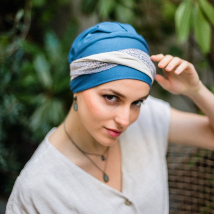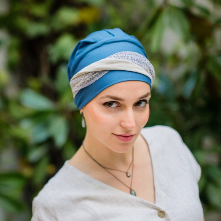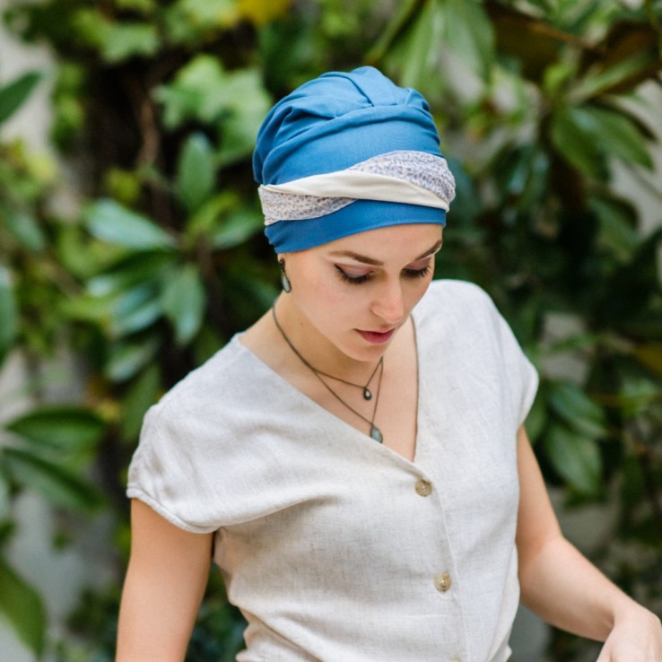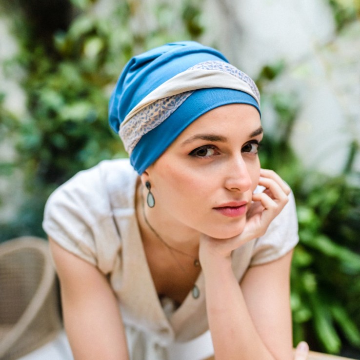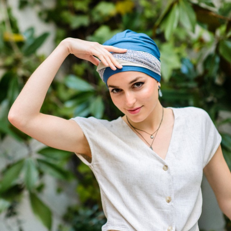 Confeccionado a mano con tejido de bambú, destaca por su elegante tono azul con banda cruzada en contraste y estampado floral, ideal para mujeres en tratamiento de quimioterapia o con cuero cabelludo sensible.