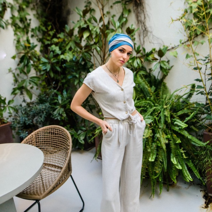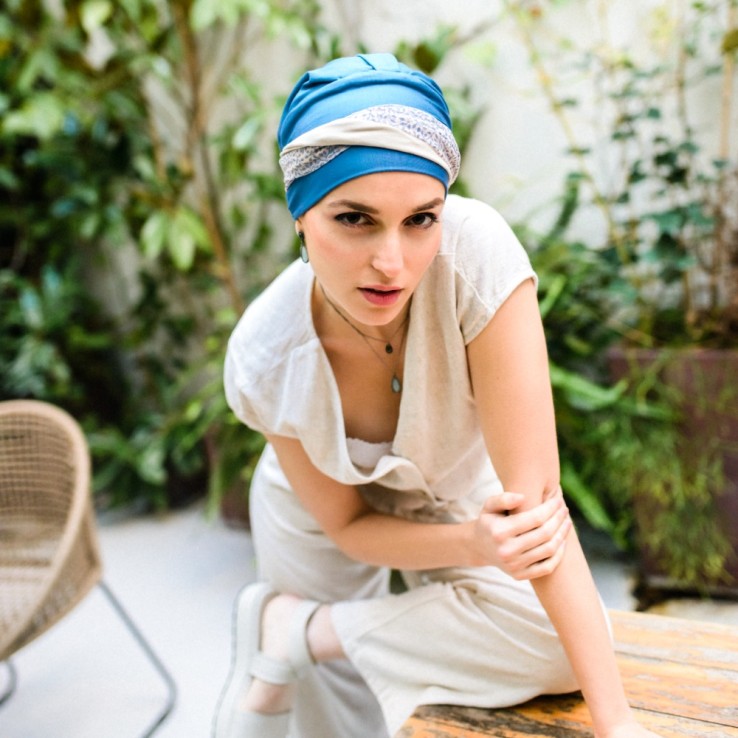 El turbante oncológico Fancy Cadaqués de Aderans Headwear combina comodidad, suavidad y estilo.