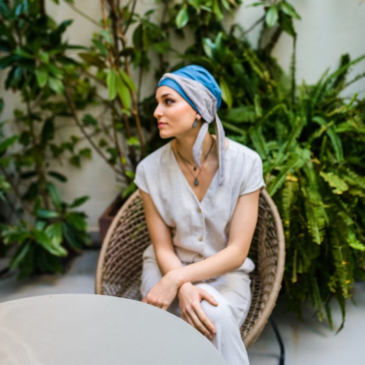El turbante oncológico Smart Cadaqués de Aderans Headwear combina estilo, confort y versatilidad.