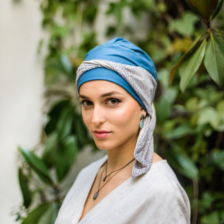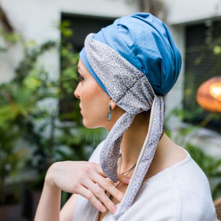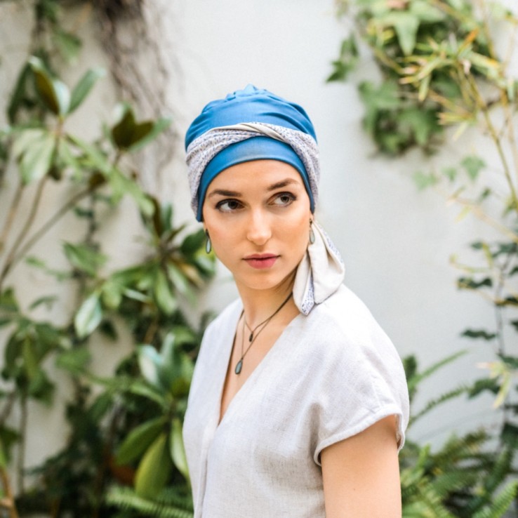 El modelo Smart Cadaqués destaca por su tonalidad azul intensa, combinada con un estampado floral muy suave y elegante, que aporta un toque de frescura y sofisticación al turbante.