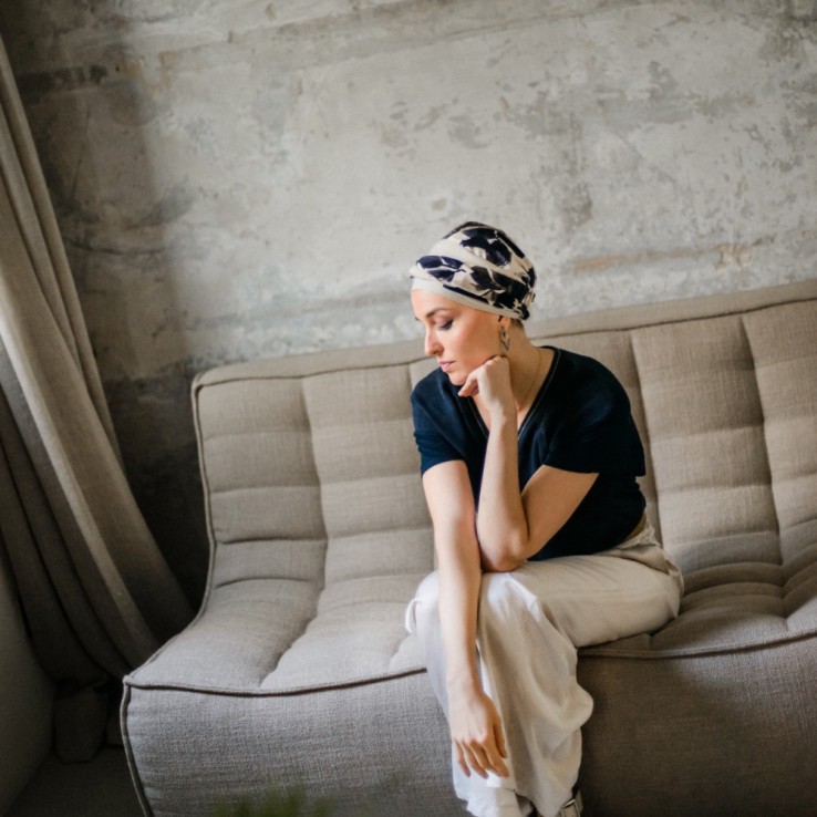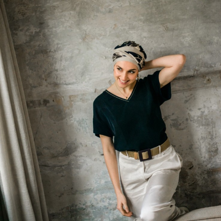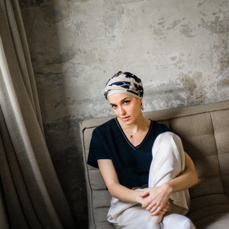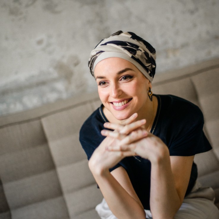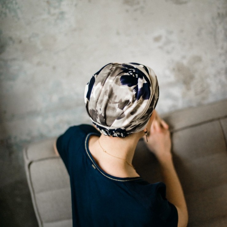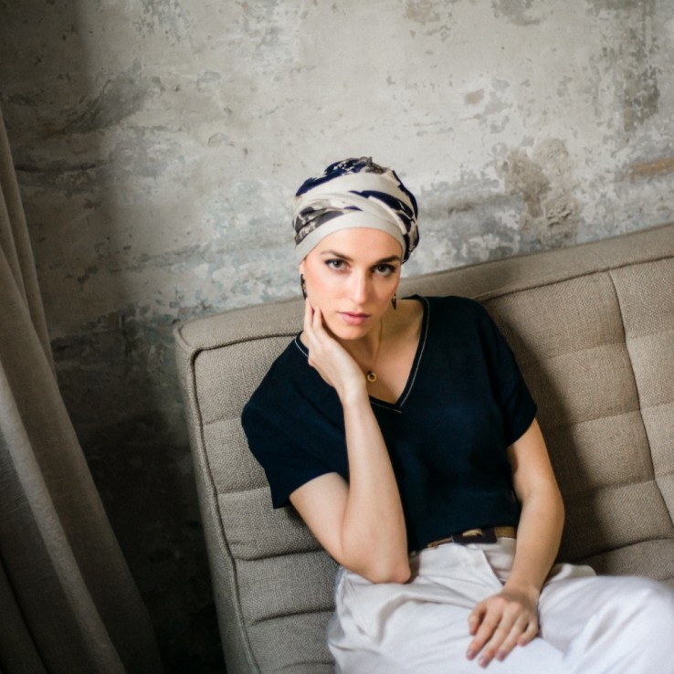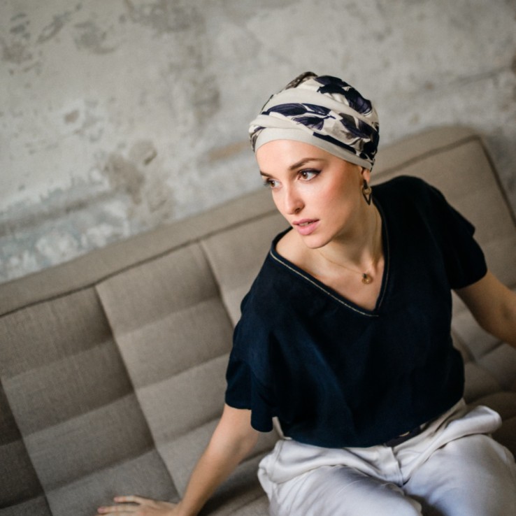 El turbante oncológico Fancy Osaka de Aderans Headwear combina comodidad, suavidad y elegancia.