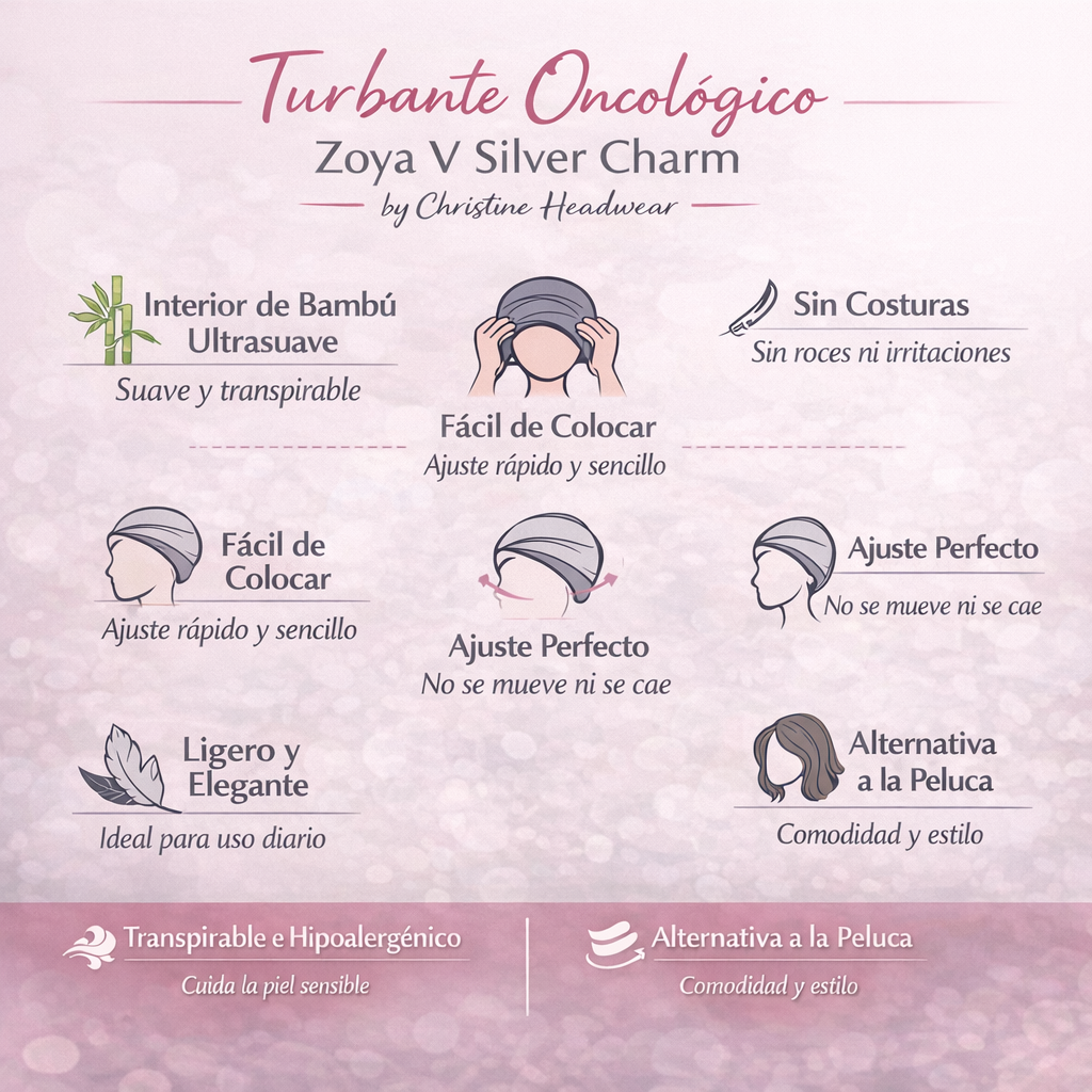 El turbante oncológico Zoya V Silver Charm de Christine Headwear está diseñado para ofrecer máximo confort, suavidad y estilo durante tratamientos como la quimioterapia o en casos de alopecia.
