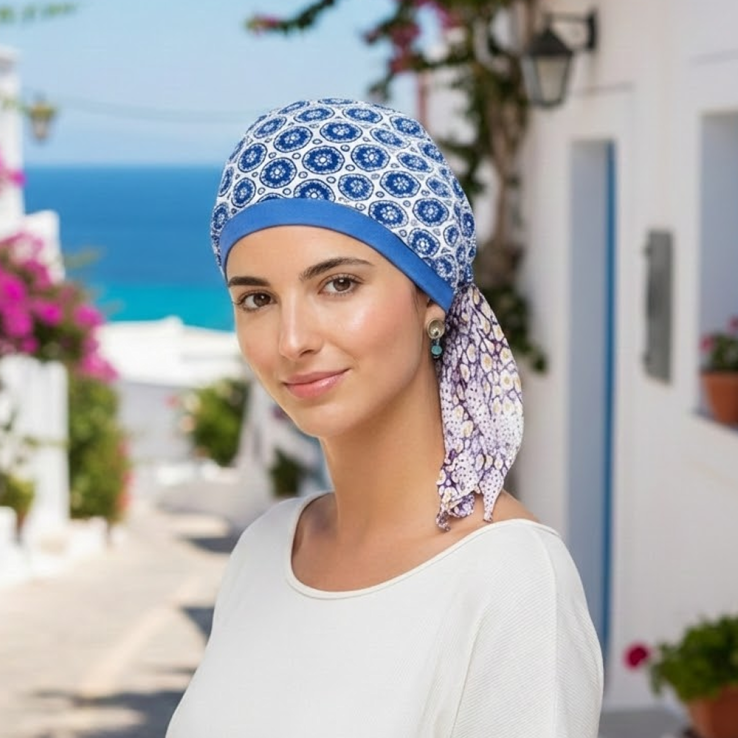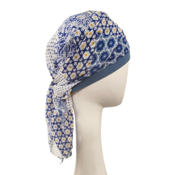 Pañuelo con interior en algodón 100% sin costuras, específico para casos de pérdida de cabello por quimioterapia y/o radioterapia.