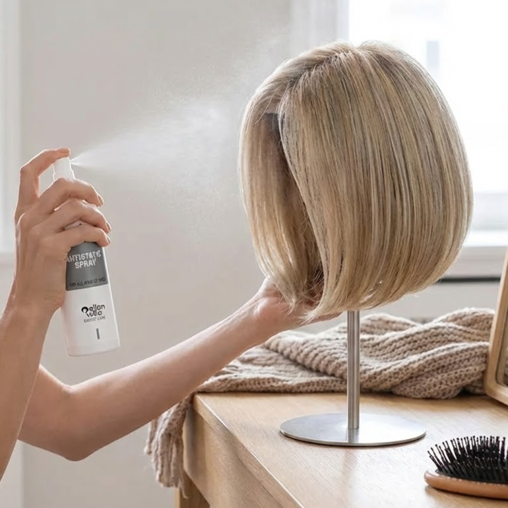 Su fórmula especializada neutraliza la electricidad estática causada por la sequedad ambiental o factores atmosféricos, uno de los problemas más habituales en el uso diario de pelucas. Al aplicarlo, crea una película protectora invisible que recubre el cabello, aportando suavidad, brillo y un aspecto saludable, sin apelmazar.