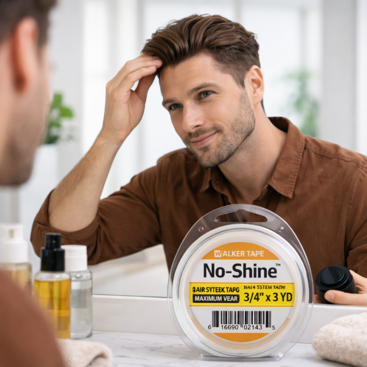 La cinta adhesiva No-Shine de Walker Tape está diseñada para la fijación segura de prótesis capilares, sistemas capilares y pelucas, ofreciendo un acabado mate invisible que evita reflejos en la línea frontal.