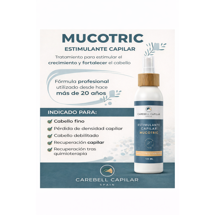 MUCOTRIC Estimulante Capilar de Carebell es una loción de tratamiento intensivo diseñada para reactivar el crecimiento del cabello, fortalecer el folículo y mejorar la densidad capilar en cabellos debilitados, finos o con pérdida de volumen.