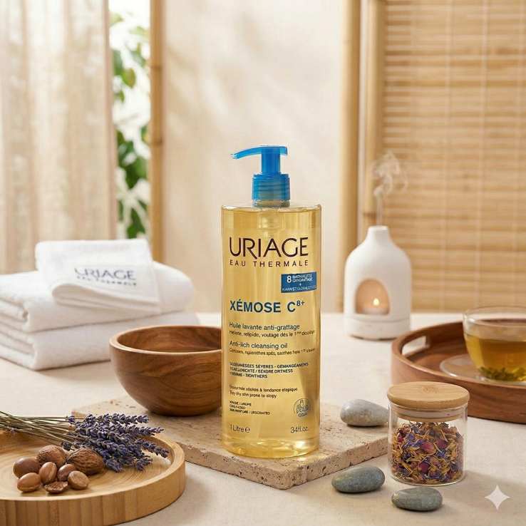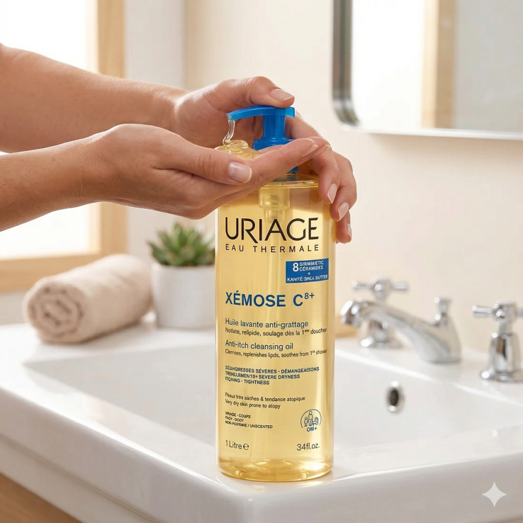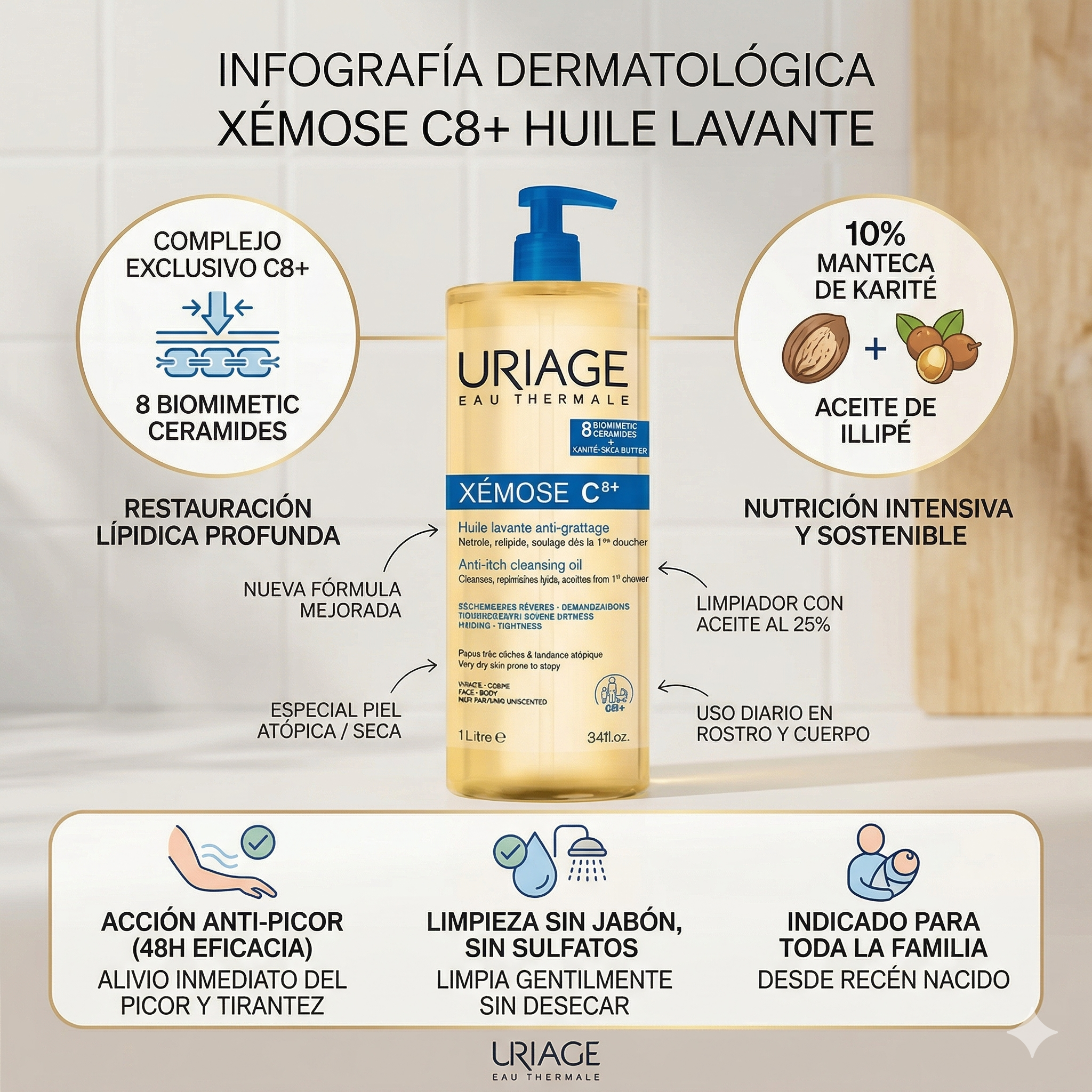 XÉMOSE C8+ Aceite Limpiador Calmante es un limpiador diario indicado para pieles muy secas con tendencia al eccema atópico, apto para toda la familia, incluso recién nacidos. Su fórmula innovadora con 8 ceramidas biomiméticas y manteca de karité repara, calma y protege la piel desde la primera aplicación. Su textura gel en aceite se transforma en espuma suave al contacto con el agua, dejando la piel limpia, nutrida y confortable.