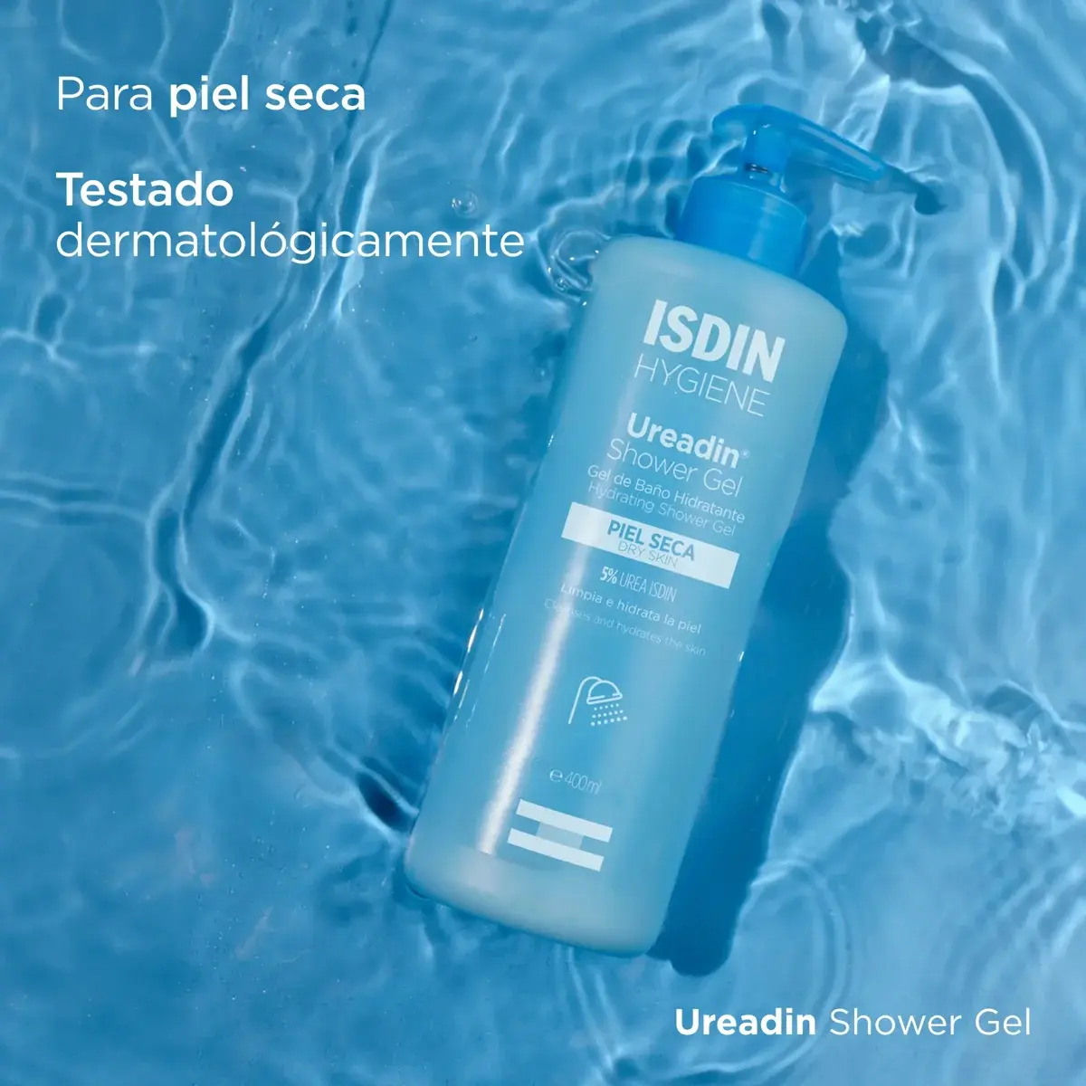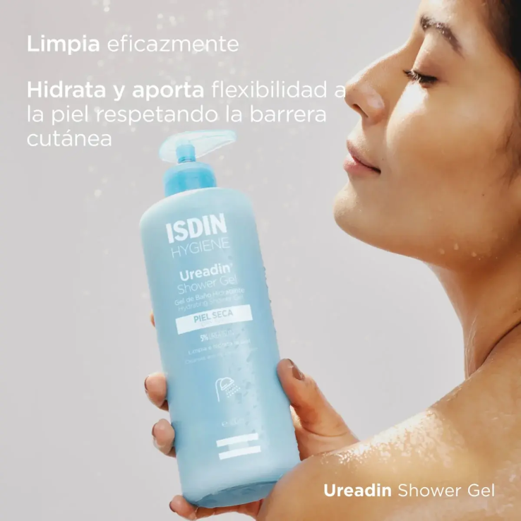 Gel de ducha sin jabón con 5 % Urea ISDIN que limpia suavemente y mantiene la hidratación de piel seca o tirante, respetando la barrera cutánea.