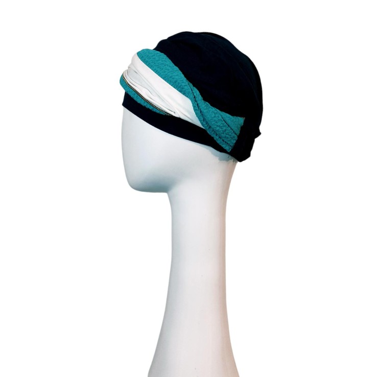 El turbante oncológico ELEGANCE TURQUESA GOLD es específico para casos de pérdida de cabello, ya sea por tratamientos oncológicos como la quimioterapia/radioterapia o por alopecia.
