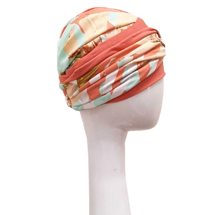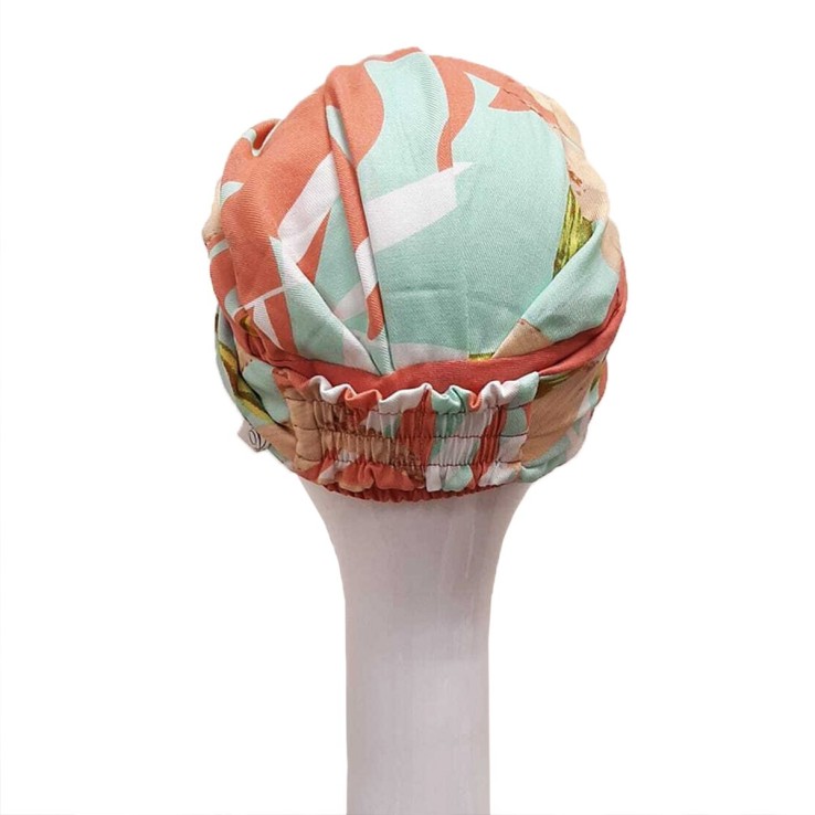 Este modelo se compone de un gorro base con una banda semi-unida en un tono coral con un estampado alegre y veraniego, ideal para esta temporada primavera/verano, ya que es un modelo muy favorecedor.