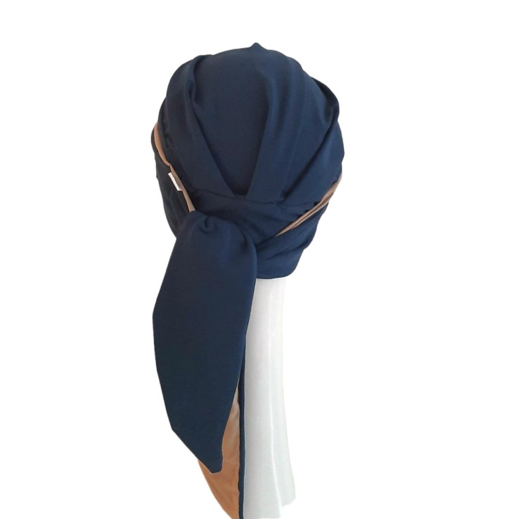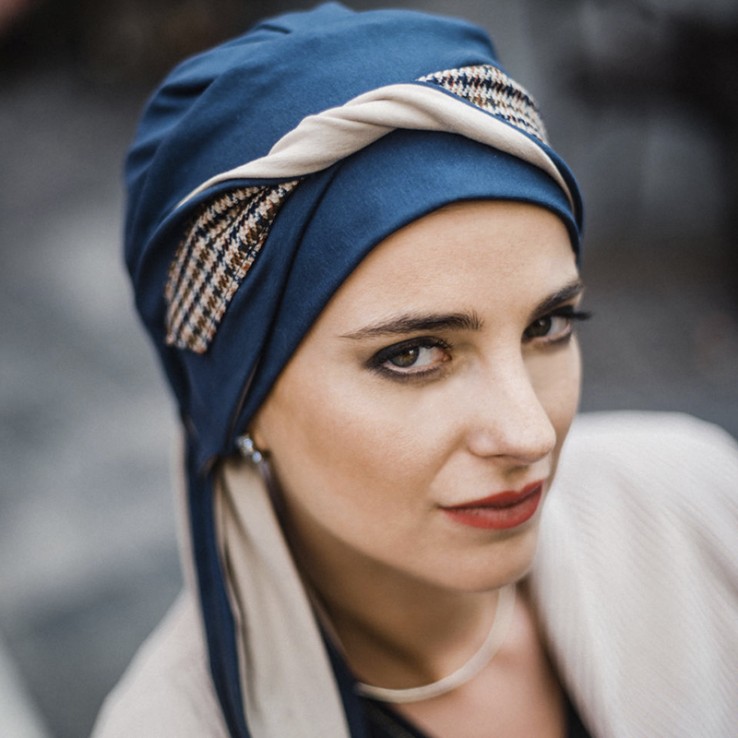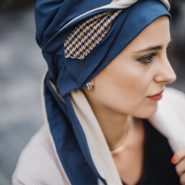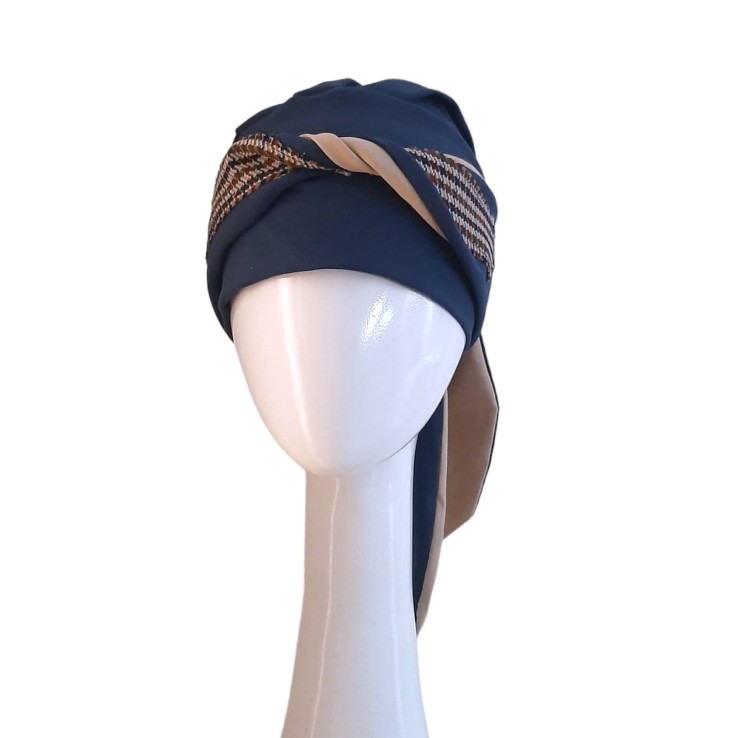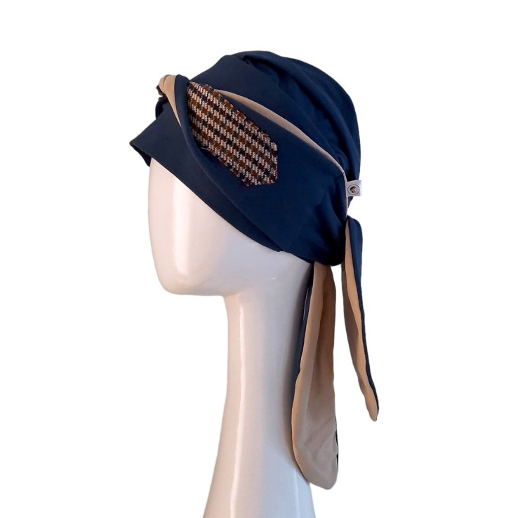Es un turbante preformado compuesto de una base en marino, junto con una banda semi-unida en la parte frontal (en las tonalidades marino y beige junto con una pasamanería geométrica en tonalidades marrón y marino) y unas cintas en tonalidades marino y beige, que las podemos atar como más nos guste.