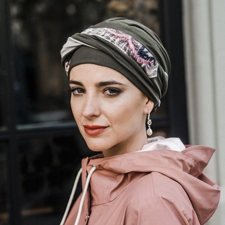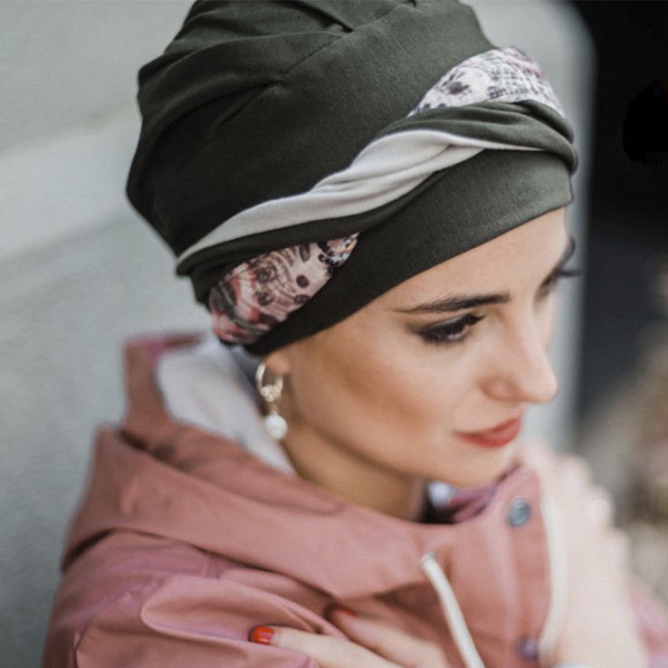 Se compone de un gorrito base de color caqui con una banda semi-unida cosida en la parte de la nuca, en tonalidades caqui y beige con un estampado velvet muy favorecedor, además tiene un fruncido en la parte trasera, lo que hace que el gorrito sea muy ajustable y fácil de colocar.
