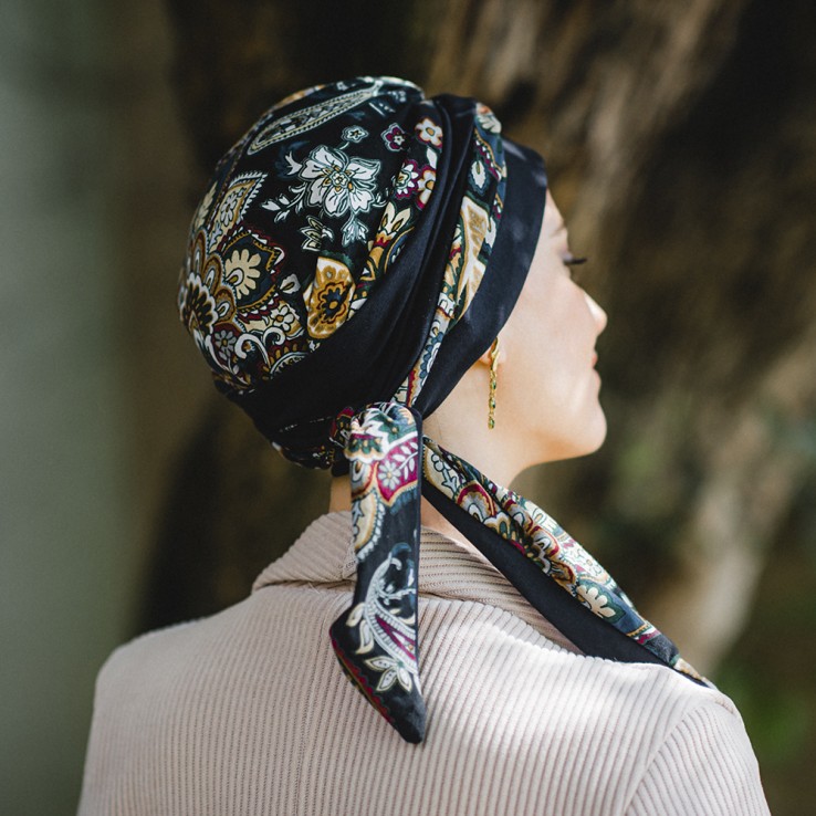 Pañuelo oncológico LUCIA BLACK CACHEMIRA de CAREBELL HEADWEAR específico para casos de pérdida de cabello ya sea debido a tratamientos oncológicos o por alopecia.