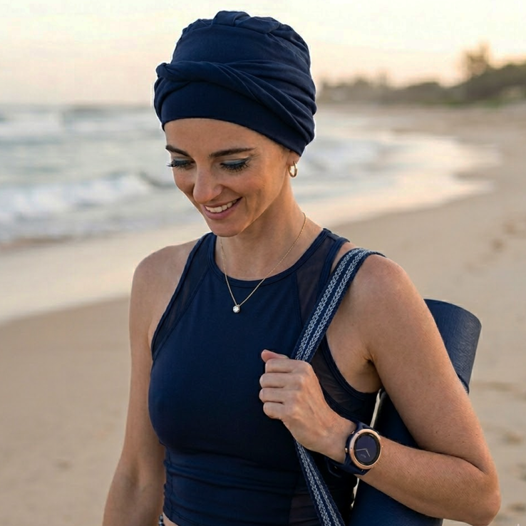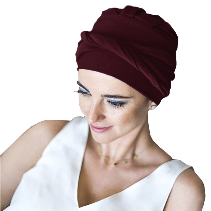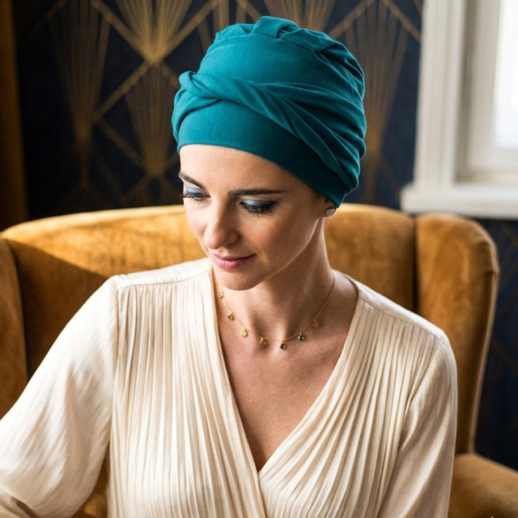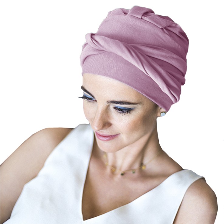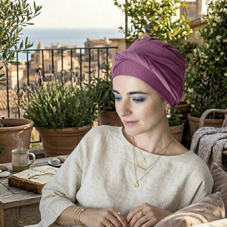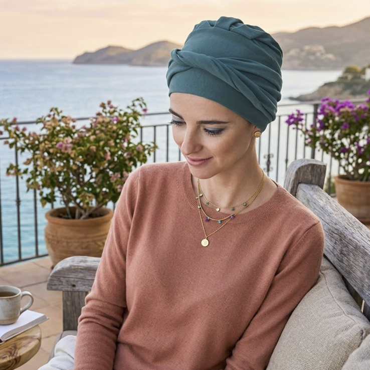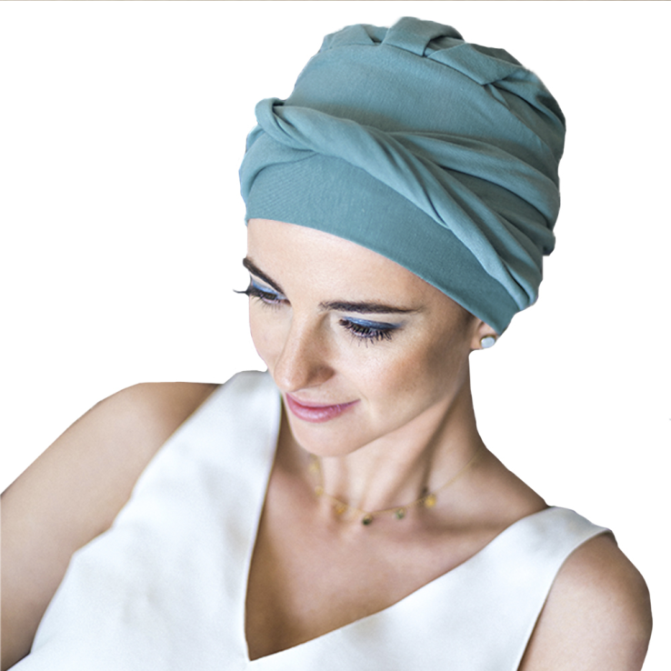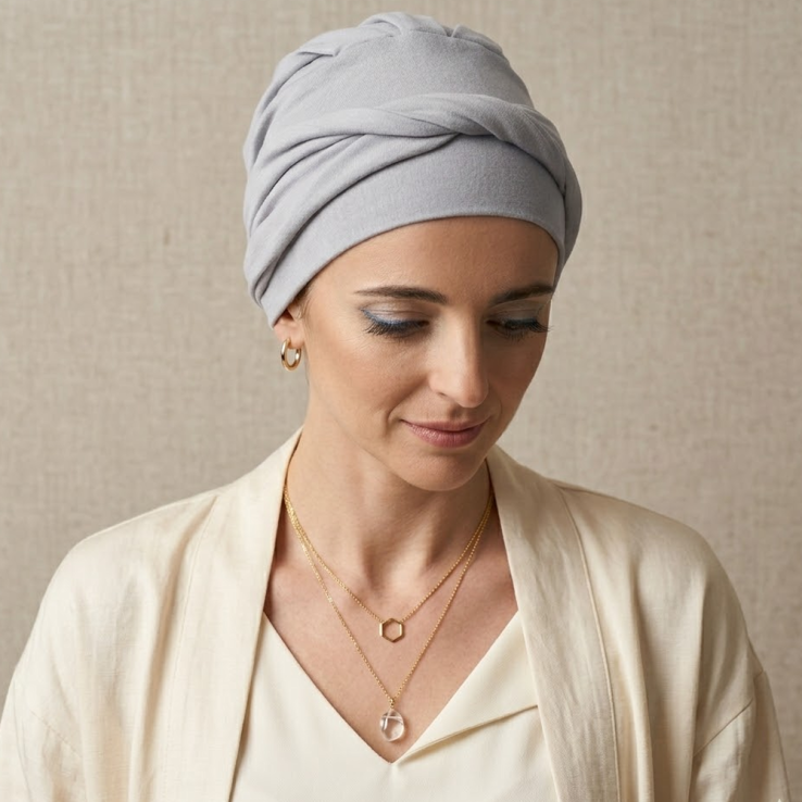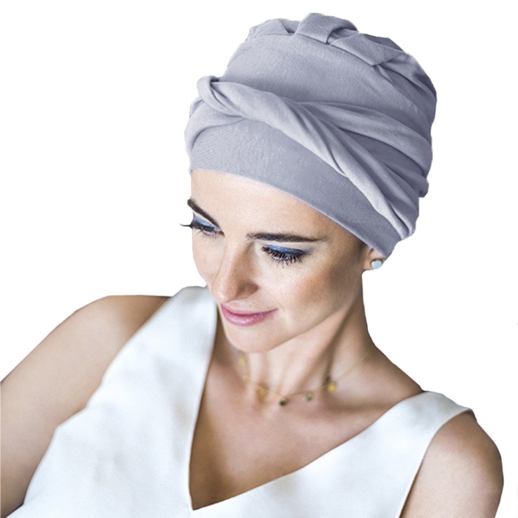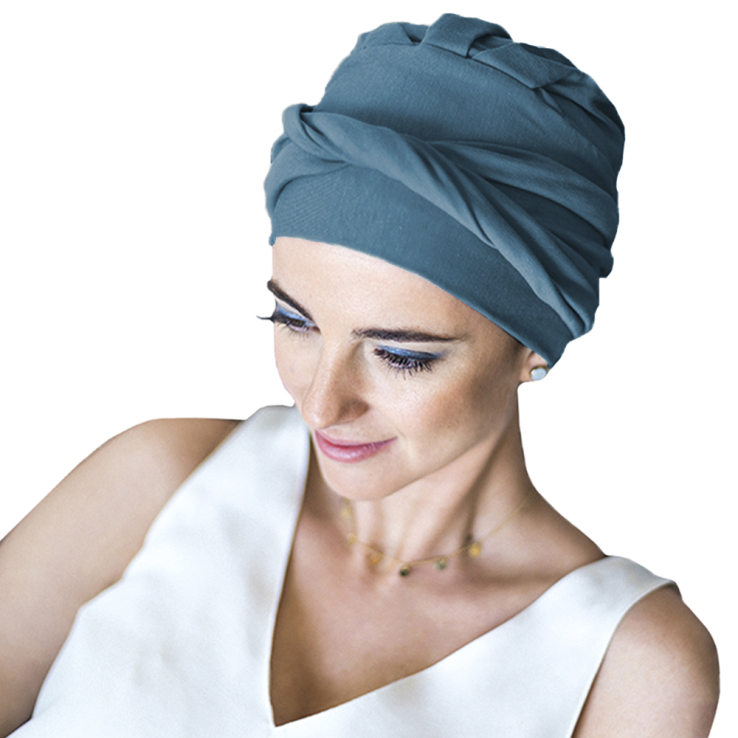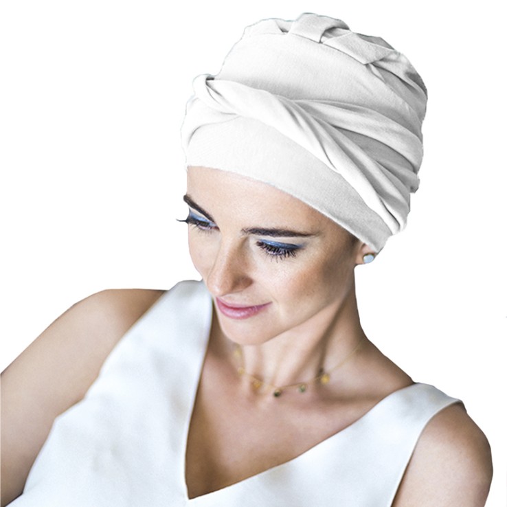 El turbante Confort Bambú está diseñado para personas con pérdida de cabello por tratamientos oncológicos o por alopecia femenina, areata o frontal fibrosante.
