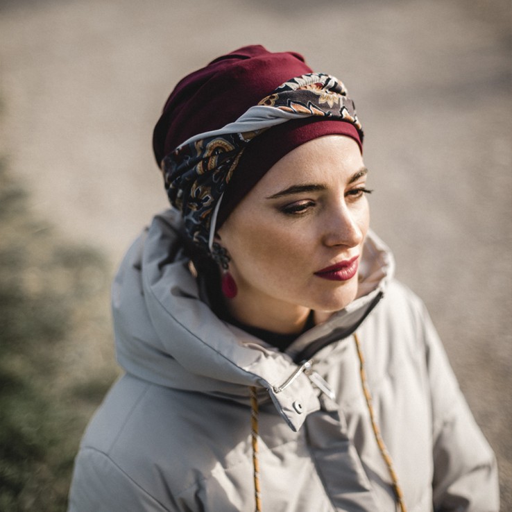 El turbante CONFORT BURDEOS CACHEMIRA es específico para casos de pérdida de cabello, ya sea por alopecia o por tratamientos oncológicos, como la quimioterapia/radioterapia.