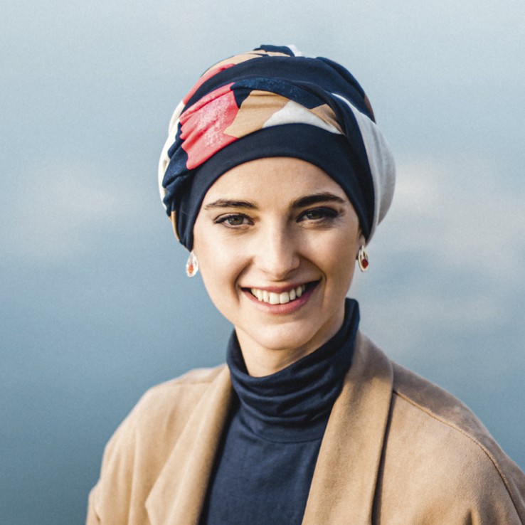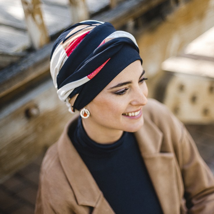 El turbante oncológico ELEGANCE METROPOLITAN esta confeccionado a mano con tejido de gran calidad de algodón, característico por ser muy cómodo y transpirable.