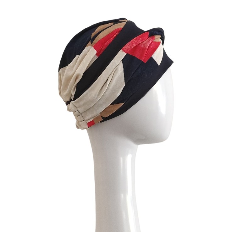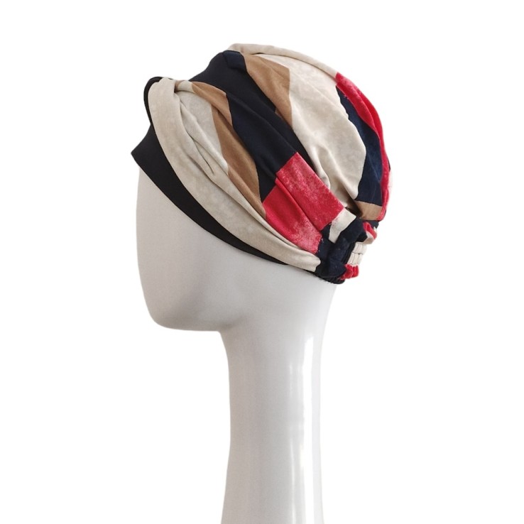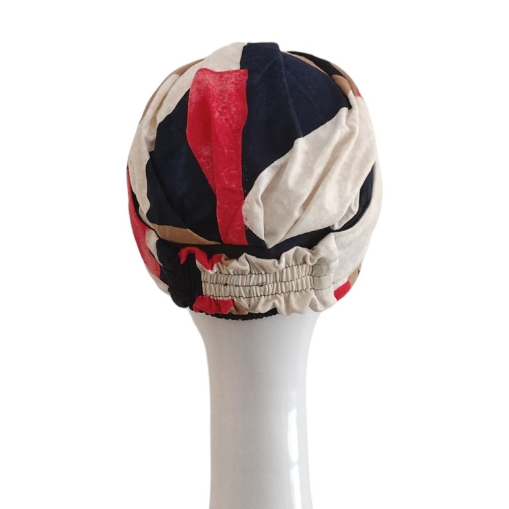 Es un turbante pre-formado de muy fácil colocación y no contiene costuras interiores ideal para evitar roces y molestias innecesarios.