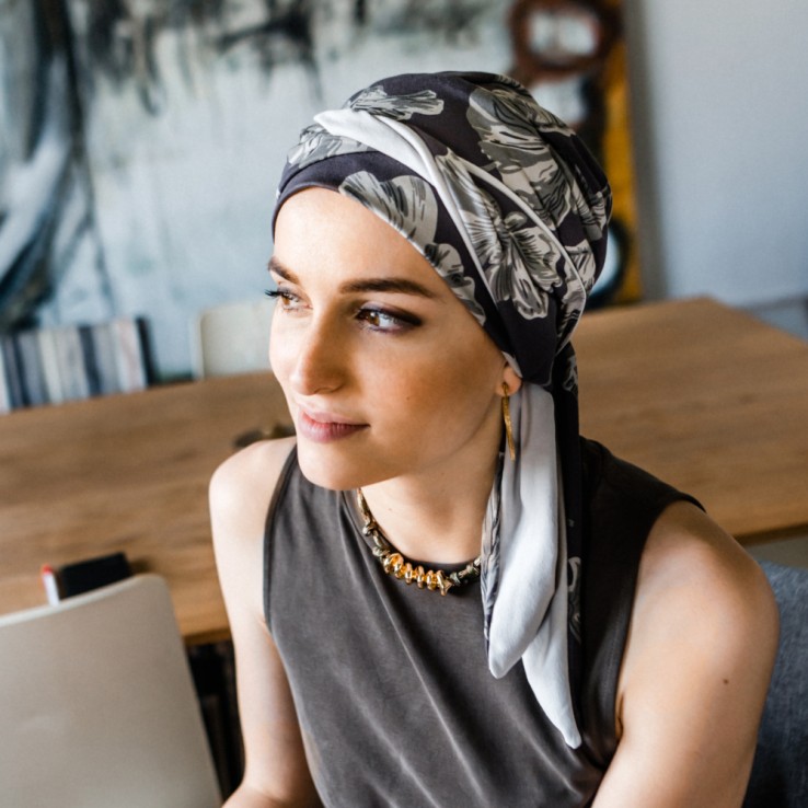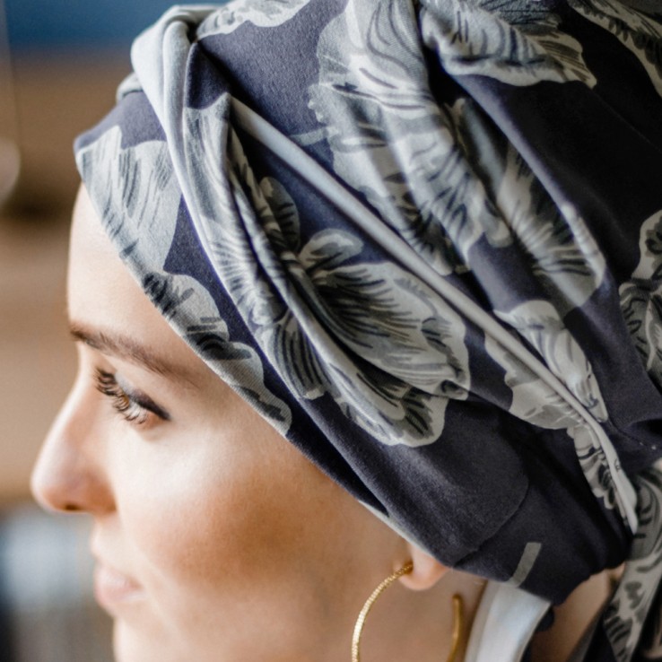 Pañuelo oncológico preformado, fácil de colocar.