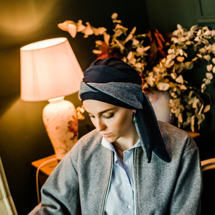 Turbante oncológico preformado en algodón suave, transpirable y sin costuras internas.