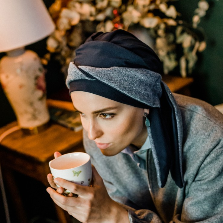 Gracias a sus cintas semiunidas en la parte trasera, el turbante permite personalizar el volumen y la forma según las preferencias de cada usuaria, aportando un volumen favorecedor y un estilo femenino y moderno.