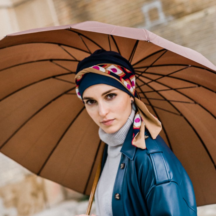 El modelo SMART OCHENTA’S destaca por su base en color navy elegante, que combina con unas cintas traseras reversibles muy originales: una cara en tono camel clásico y la otra con un estampado abstracto multicolor (en tonos rojo, blanco, rosa, marino y camel), ideal para quienes buscan un look más vivo y con personalidad. Las cintas semiunidas permiten ajustar el turbante al gusto, creando volumen y estilizando la silueta con un acabado femenino y favorecedor.