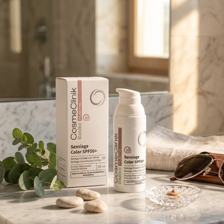 Basiko Sensiage Color es un tratamiento facial hidratante de día con color y protección solar muy alta SPF 50+, diseñado especialmente para pieles