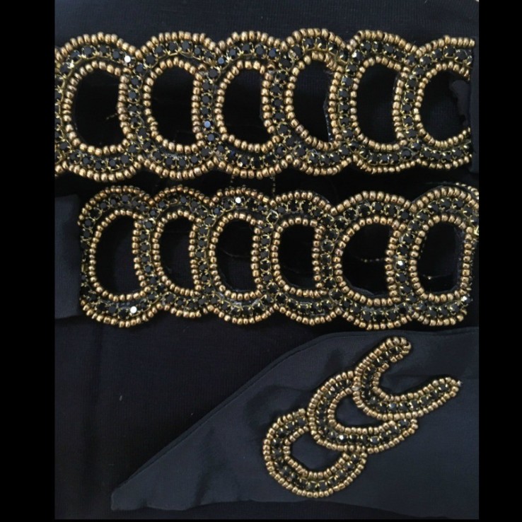 - Una cinta negra con preciosos detalles de pedrería en dorado y negro. El detalle de pedrería se compone de piezas doradas y piedras color negro tal y como se ve en las fotos de detalle.