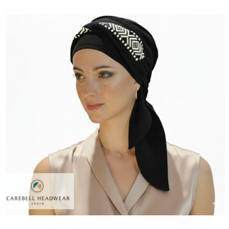 Es un pañuelo diseñado específicamente para llevar en casos de pérdida de cabello durante los tratamientos oncológicos y también en los diferentes tipos de alopecia.