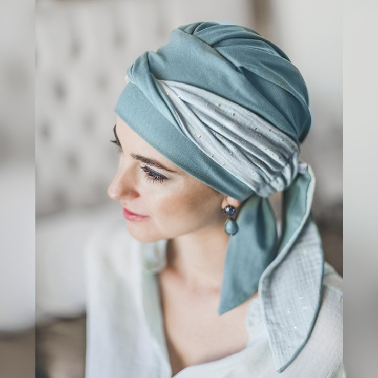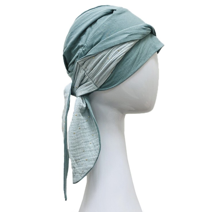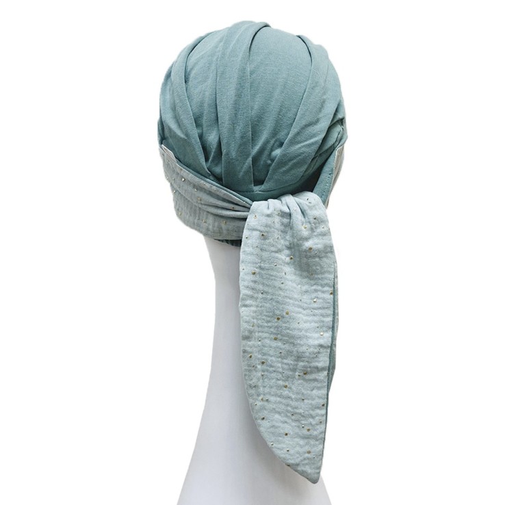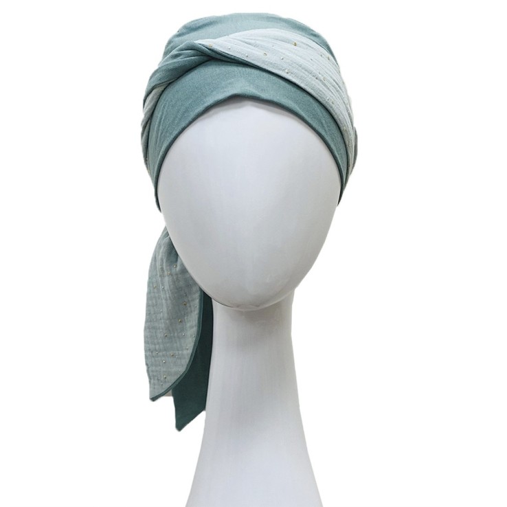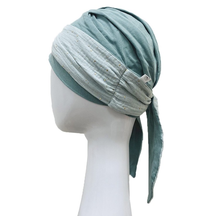 Este pañuelo se compone de un gorrito en color aguamarina, junto con una banda frontal y unas cintas, del mismo color, añadiendo mini gotas doradas incrustadas en el tejido.