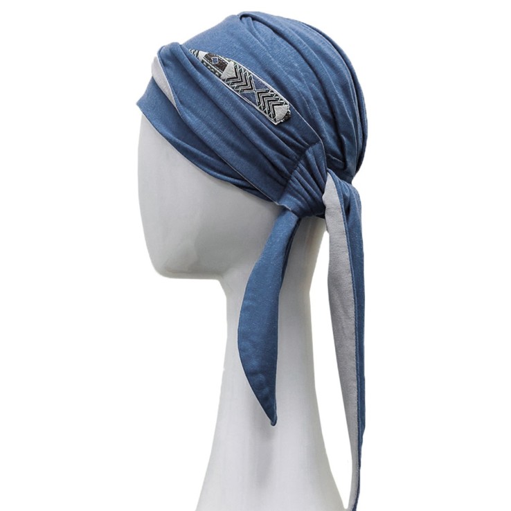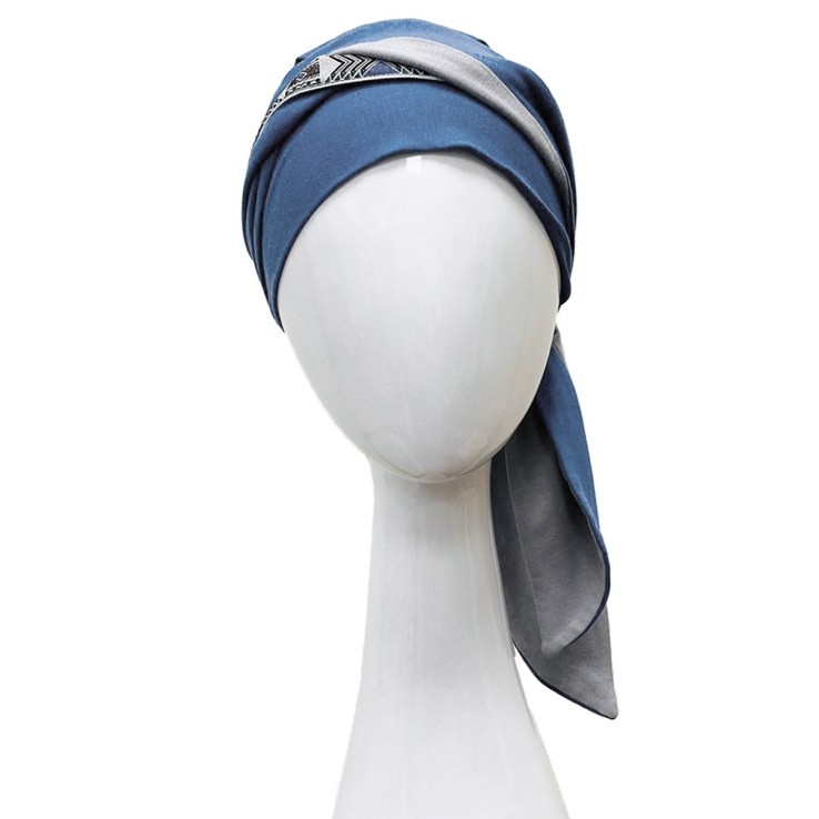Encontraremos la base en color azulon, junto con una banda semi-unida para dar volumen , con media banda en gris perla y una bonita pasamanería étnica a juego. Además también lleva dos cintas largas que las puedes atar como más te guste.