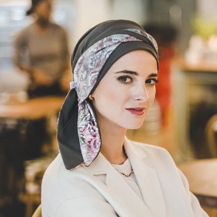 Pañuelo diseñado específicamente para llevar en casos de pérdida de cabello durante los tratamientos oncológicos y también en los diferentes tipos de alopecia.