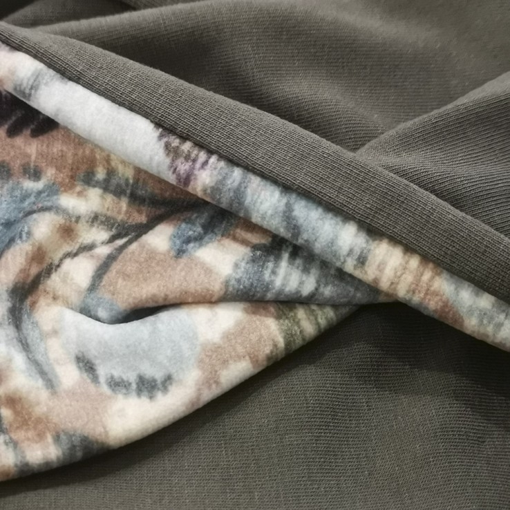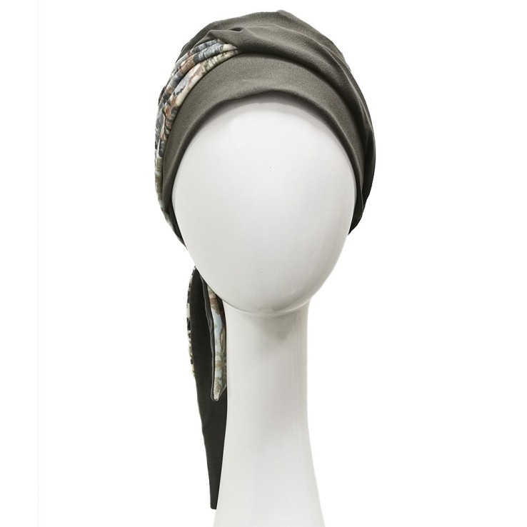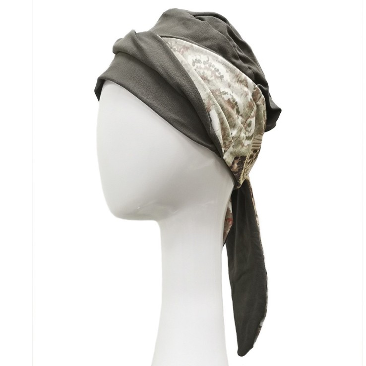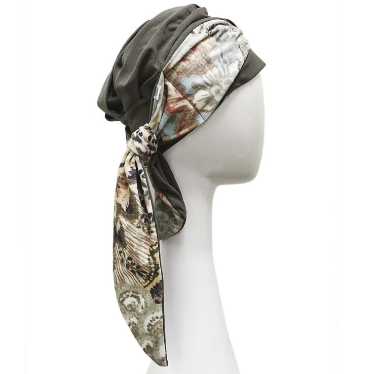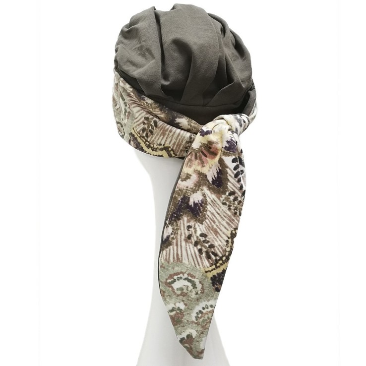 Se compone de un gorro base en color verde caqui con una banda que rodea el contorno (Media banda del mismo color y la otra media en un bonito estampado velvet), cosida en la parte trasera y de la que salen dos cintas, que únicamente tendremos que hacer una lazada o atarlas para que el pañuelo quede perfectamente ajustado a la cabeza.