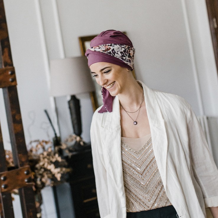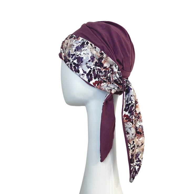 Pañuelo oncológico SMOOTH MALVA FLORES de CAREBELL HEADWEAR.