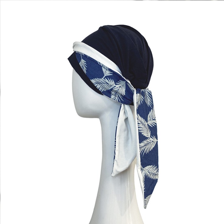 Este turbante se compone de un gorrito en color marino, junto con una banda frontal y unas cintas que salen de la parte trasera. Por una cara son de color marfil y la otra tiene un bonito estampado de palmeras denim.