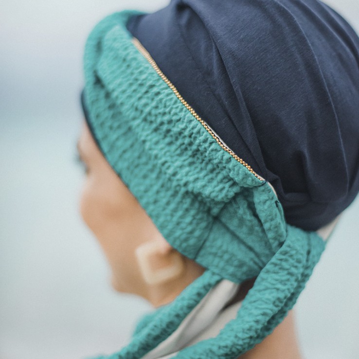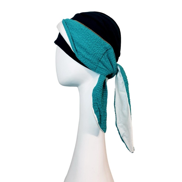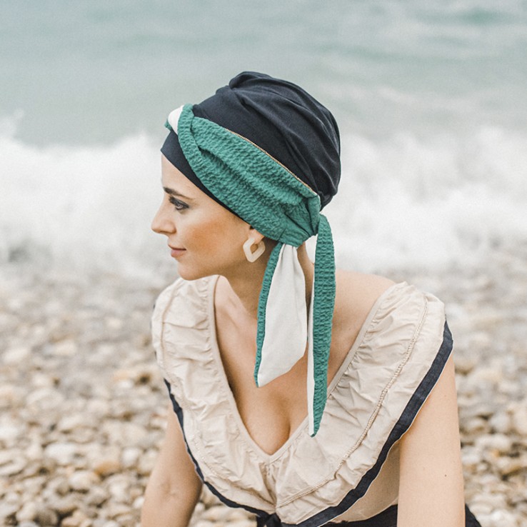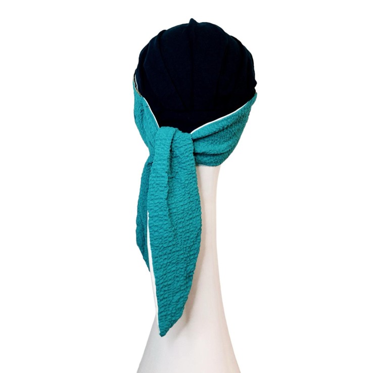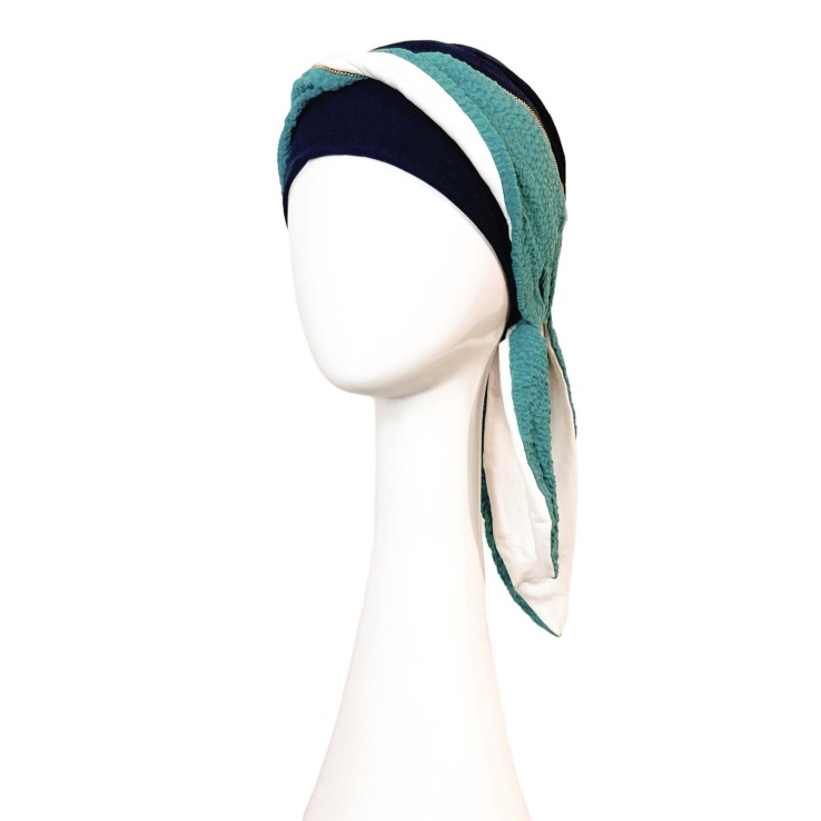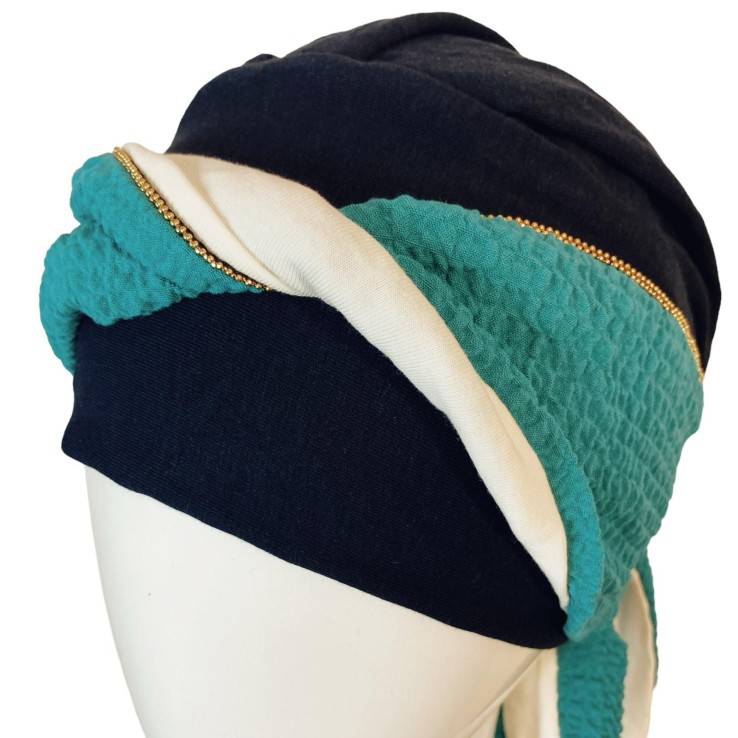 Este pañuelo se compone de un gorrito base en tonalidad marino, junto con una banda frontal que aporta el volumen deseado y unas cintas para poderlas ajustar como mas nos guste, que por una cara son beige y por la otra tiene un estampado de textura en tonalidad turquesa con un ribete dorado en uno de los lados de la cinta, lo que hace que sea un modelo muy chic y favorecedor, ideal para esta temporada.