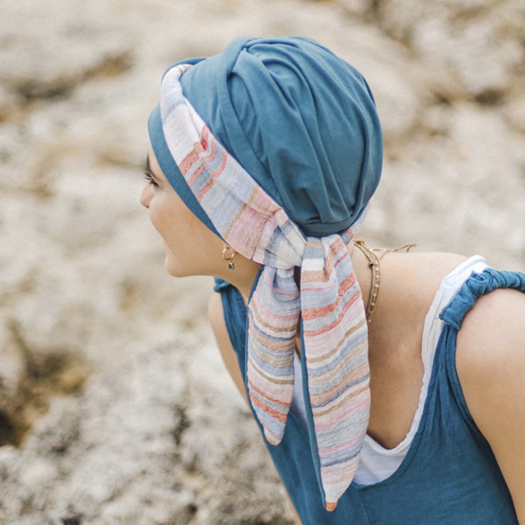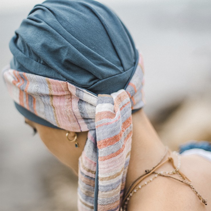 El turbante SMOOTH MEDITERRANEO ACERO está confeccionado en bambú, tejido de gran calidad, ideal para casos de pérdida de cabello, ya sea por alopecia o por tratamientos oncológicos.