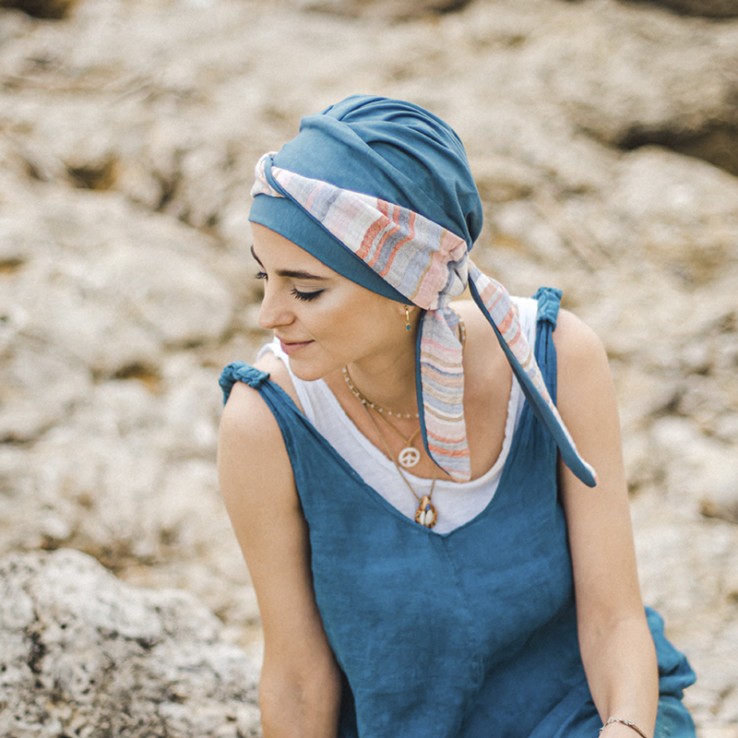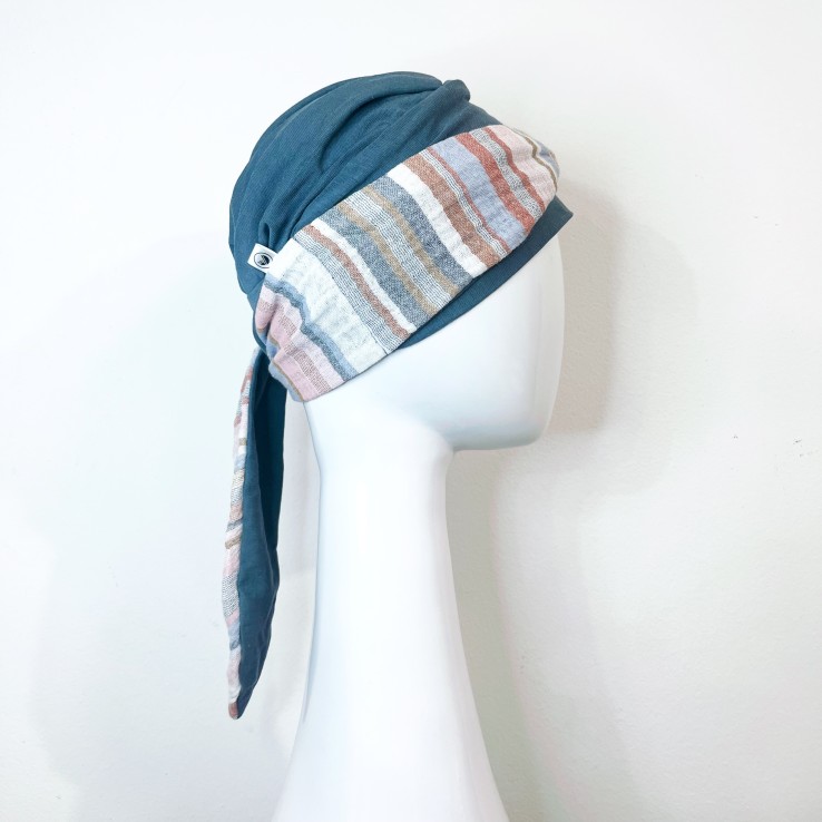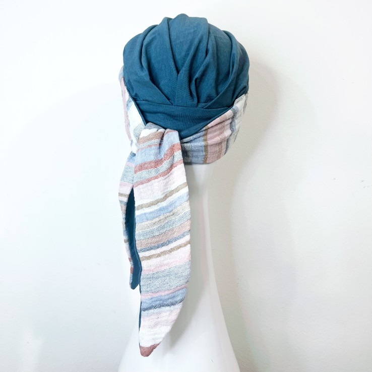 El diseño MEDITERRANEO ACERO es un turbante veraniego y muy favorecedor, la base en tonalidad acero combina perfectamente con la diadema, que por un lado es lisa en la misma tonalidad que la base y por el otro tiene un estampado rayas, aportándole el toque ideal para que te sientas guapa y favorecida.