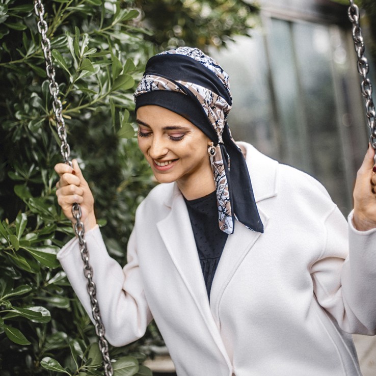 La combinacion de la tonalidad marino junto con un bonito estampado floral en tonalidades beige, marino y blanco hace que sea un turbante muy favorecedor.