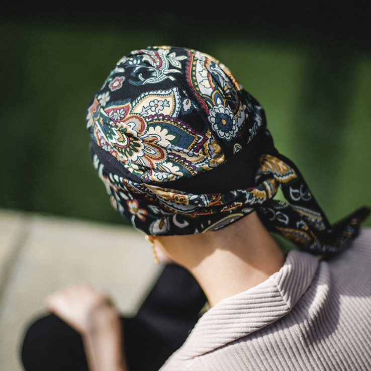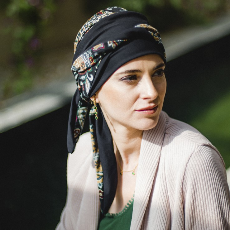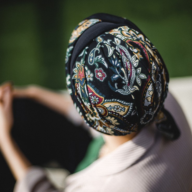 El modelo SMOOTH BLACK CACHEMIRA se compone de un gorrito base con una banda semi-unida que rodea el contorno, cosida en la parte trasera y de la que salen dos cintas, que únicamente tendremos que atar para que el turbante quede perfectamente ajustado a la cabeza.