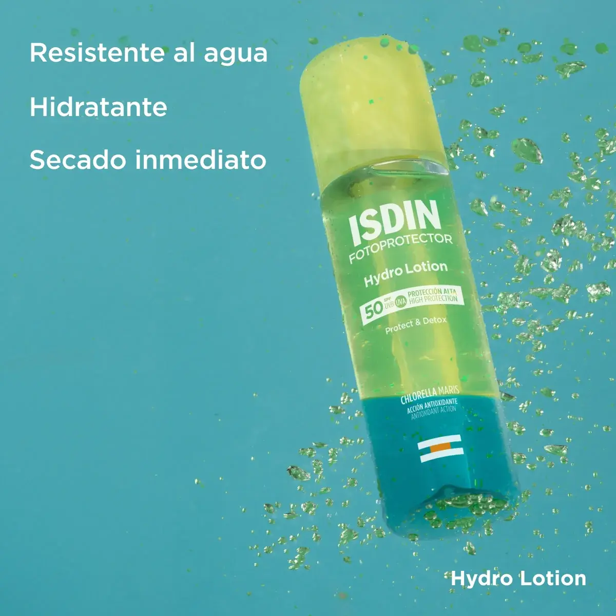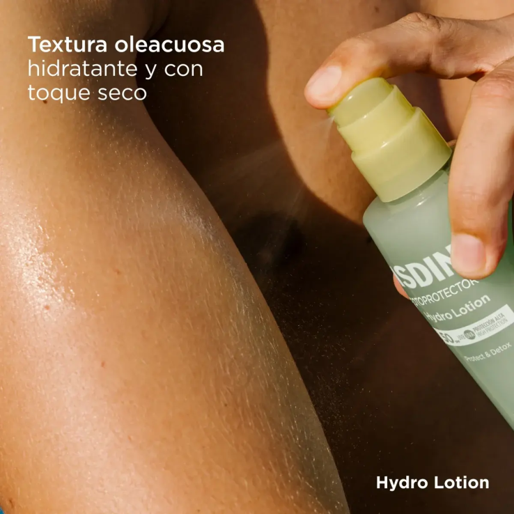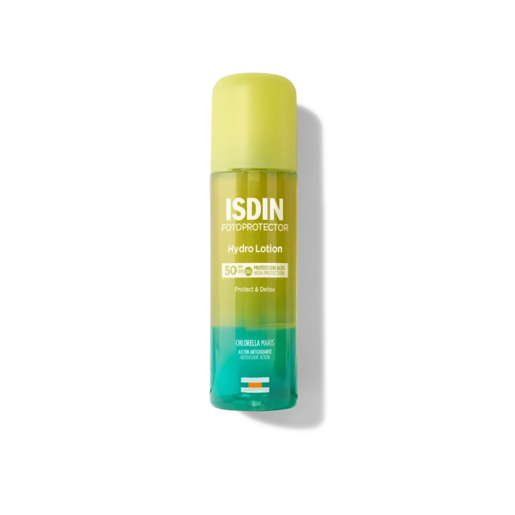 ISDIN HydroLotion SPF 50 es un fotoprotector solar corporal bifásico de alta eficacia que ofrece una protección solar SPF 50 frente a los rayos UVB y UVA, al mismo tiempo que hidrata y detoxifica la piel. Su