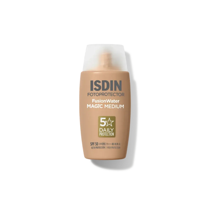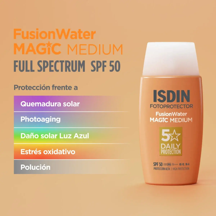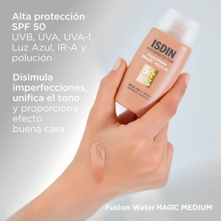 ISDIN Fusion Water MAGIC Medium SPF 50 es un fotoprotector solar facial con color ideal para uso diario. Ofrece alta protección frente