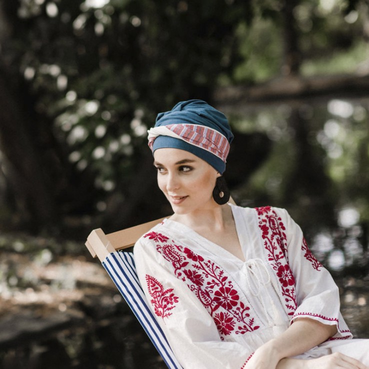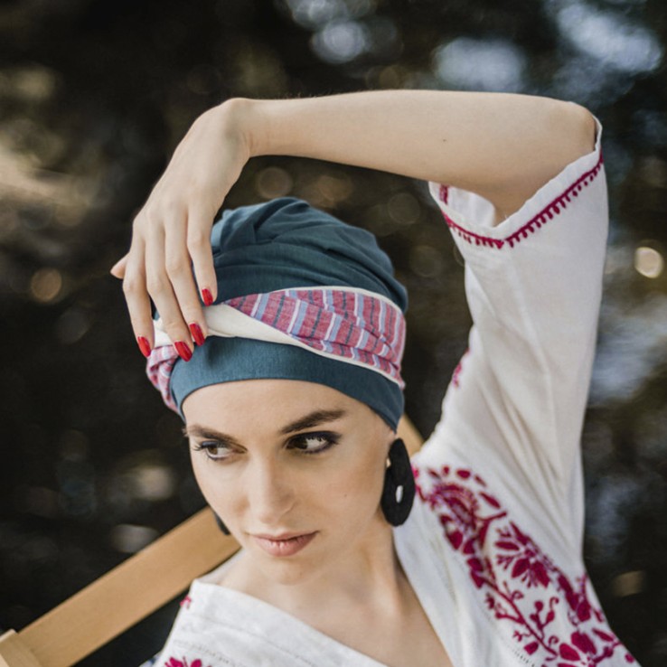 El turbante FANCY FORMENTERA es específico para las pieles más sensibles en casos de alopecia o pérdida de cabello debido a tratamientos oncológicos como la quimioterapia/radioterapia.