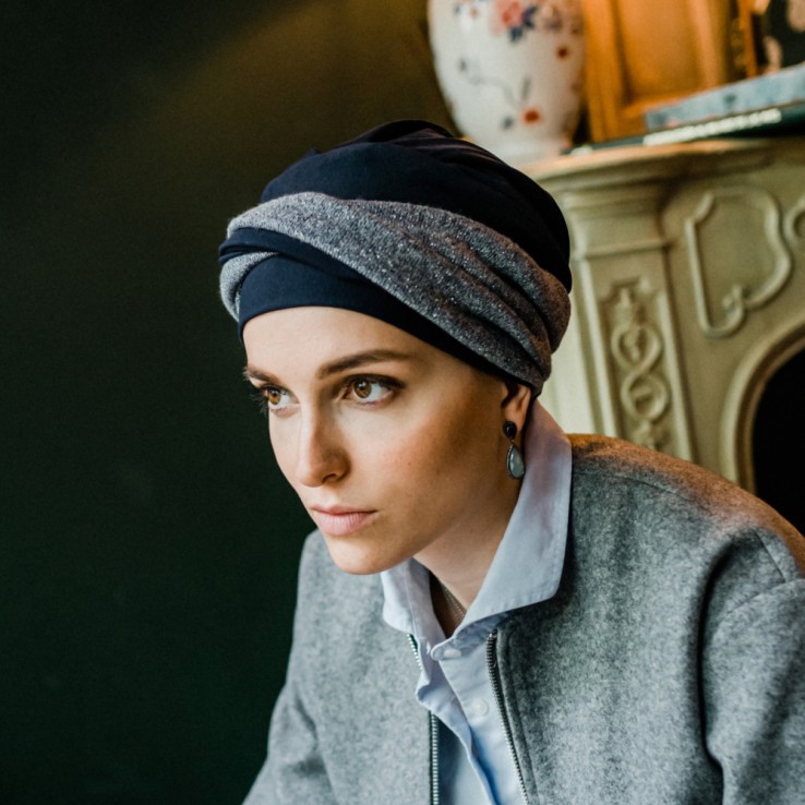 El Fancy Glitter Navy de Aderans Headwear está diseñado pensando en quienes están atravesando tratamientos médicos como quimioterapia o radioterapia, o conviven con alopecia, y necesitan una solución que combine comodidad, protección y estilo.